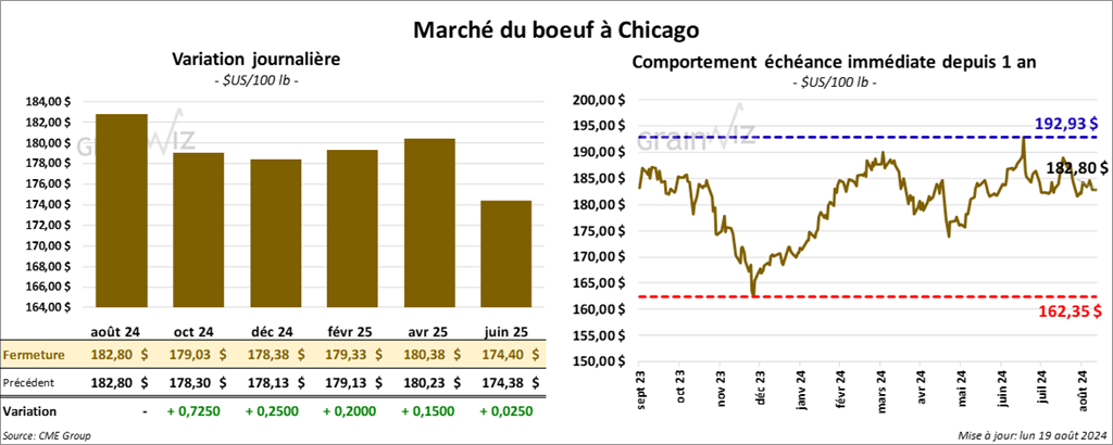 Le contrat de bœuf US août 24 a clôturé à 182,80 $ (0,0). Celui oct. 24 a fermé à 179,03 $ (+ 73 cents). Celui déc. 24 a terminé à 178,38 $ (+ 25 cents). Quant au veau US, le contrat août 24 a fini à 242,38 cents (- 40 cents). Celui sept. 24 a clôturé à 239,28 $ (- 23 cents). Celui oct. 24 a fermé à 235,88 $ (- 7 cents).