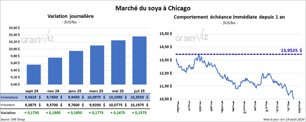 Le contrat de soya US sept. 24 a clôturé à 9,5625 $ (+ 17 ½ cents). Celui nov. 24 a fermé à 9,7600 $ (+ 19 cents). Celui janv. 25 a terminé à 9,9450 $ (+ 18 ½ cents). Quant au tourteau de soya US, le contrat sept. 24 a fini à 311,70 $/tonne (+ 8,30 $/tonne). Celui oct. 24 a clôturé à 308,10 $/tonne (+ 8,20 $/tonne). Celui déc. 24 a fermé à 310,50 $/tonne (+ 8,40 $/tonne). Du côté de l’huile de soya US, le contrat sept. 24 a terminé à 40,47 $ (+ 52 points). Celui oct. 24 a fini à 39,66 $ (+ 48 points).