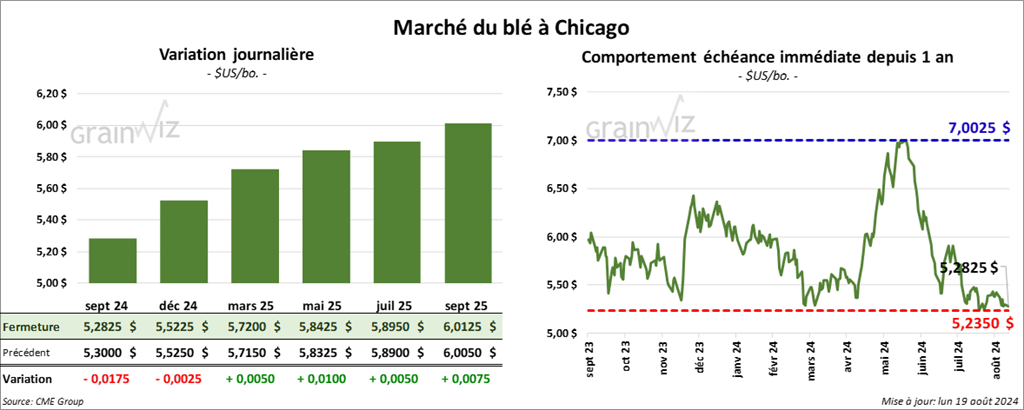À Chicago, le contrat de blé sept. 24 a clôturé à 5,2825 $ (- 1 ¾ cents). Celui déc. 24 a fermé à 5,5225 $ (- ¼ cent). Celui mars 25 a terminé à 5,7200 $ (+ ½ cent). À Kansas, le contrat de blé dur rouge sept. 24 a fini à 5,4060 $ (+ 1 cent). Celui déc. 24 a clôturé à 5,5640 $ (+ 1 ½ cent). Celui mars 25 a fermé à 5,6900 $ (+ 1 ½ cent). À Minneapolis, le contrat de blé de printemps US sept. 24 a terminé à 5,8725 $ (- 6 cents). Celui déc. 24 a fini à 6,0350 $ (- 5 ½ cents). Celui mars 25 a clôturé à 6,2025 $ (- 5 cents).