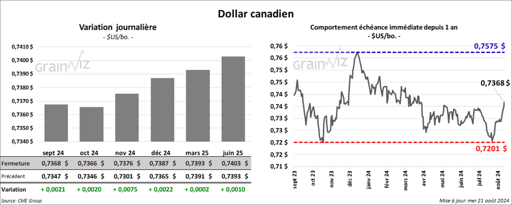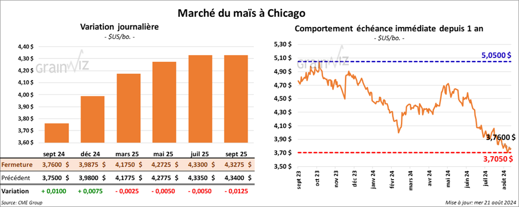 Le contrat de maïs US sept. 24 a clôturé à 3,7600 $ (+ 1 cent). Celui déc. 24 a fermé à 3,9875 $ (+ ¾ cent). Celui mars 25 a terminé à 4,1750 $ (- ¼ cent).