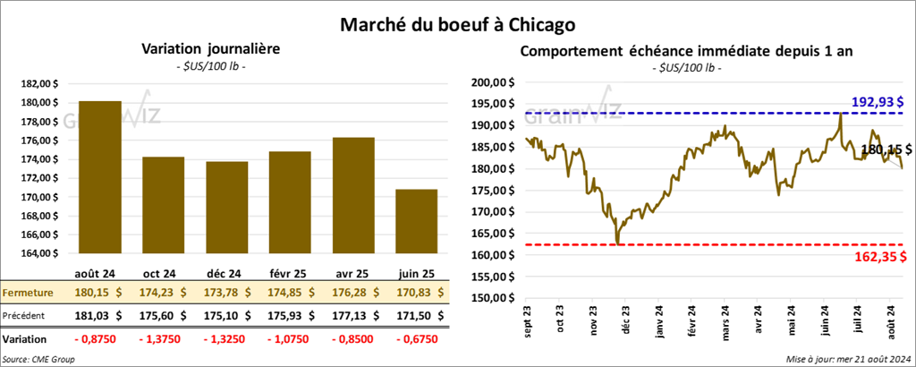 Le contrat de bœuf US août 24 a clôturé à 180,15 $ (- 88 cents). Celui oct. 24 a fermé à 174,23 $ (- 1,38 $). Celui déc. 24 a terminé à 173,78 $ (- 1,33 $). Quant au veau US, le contrat août 24 a fini à 239,25 $ (+ 1,05 $). Celui sept. 24 a clôturé à 234,80 $ (+ 30 cents). Celui oct. 24 a fermé à 230,70 $ (- 63 cents).
