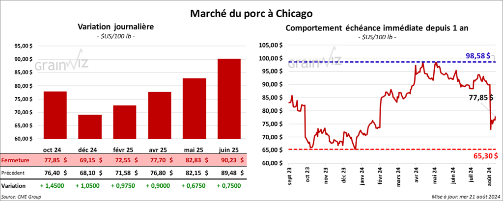 Le contrat de porc US oct. 24 a clôturé à 77,85 $ (+ 1,45 $). Celui déc. 24 a fermé à 69,15 $ (+ 1,05 $). Celui févr. 25 a terminé à 72,55 $ (+ 98 cents).
