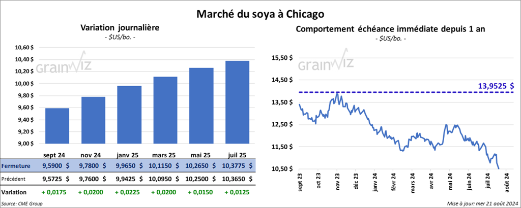 Le contrat de soya US sept. 24 a clôturé à 9,5900 $ (+ 1 ¾ cent). Celui nov. 24 a fermé à 9,7800 $ (+ 2 cents). Celui janv. 25 a terminé à 9,9650 $ (+ 2 ¼ cents). Quant au tourteau de soya US, le contrat sept. 24 a fini à 312,30 $/tonne (0,0). Celui oct. 24 a clôturé à 306,70 $/tonne (+ 60 cents/tonne). Celui déc. 24 a fermé à 308,60 $/tonne (+ 30 cents/tonne). Du côté de l’huile de soya US, le contrat sept. 24 a terminé à 41,00 $ (+ 29 points). Celui oct. 24 a fini à 40,20 $ (+ 34 points).