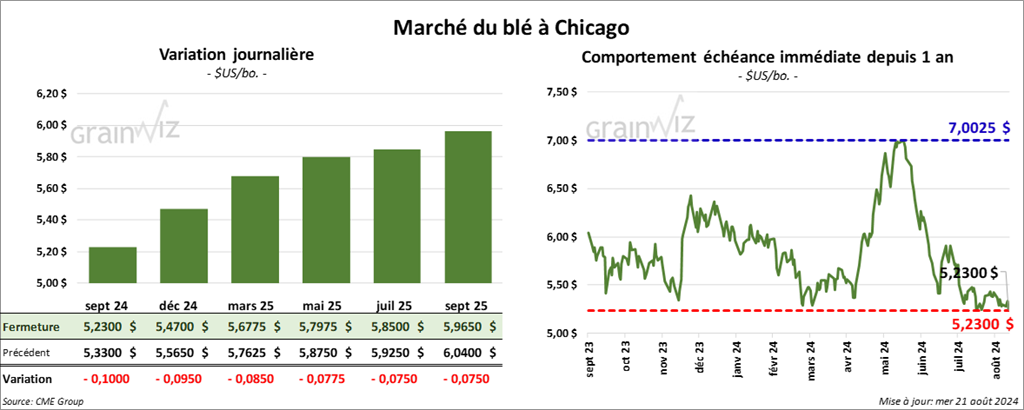 À Chicago, le contrat de blé sept. 24 a clôturé à 5,2300 $ (- 10 cents). Celui déc. 24 a fermé à 5,4700 $ (- 9 ½ cents). Celui mars 25 a terminé à 5,6775 $ (- 8 ½ cents). À Kansas, le contrat de blé dur rouge sept. 24 a fini à 5,3620 $ (- 9 ¾ cents). Celui déc. 24 a clôturé à 5,5160 $ (- 9 ½ cents). Celui mars 25 a fermé à 5,6500 $ (- 9 ½ cents). À Minneapolis, le contrat de blé de printemps US sept. 24 a terminé à 5,8650 $ (- 3 ¾ cents). Celui déc. 24 a fini à 6,0250 $ (- 4 cents). Celui mars 25 a clôturé à 6,2050 $ (- 3 ½ cents).