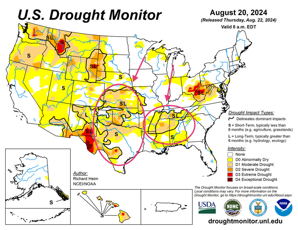 La carte US, présentée aujourd’hui par l’US Drought Monitor indique d’ailleurs que mardi dernier, le temps aride s’était amplifié dans le centre et le sud des Plaines US, soit entre le Kansas et le Texas en passant par l’Oklahoma. Certaines régions du Sud-Est US comme l’Arkansas, le Tennessee et le Mississippi auraient connu le même sort.