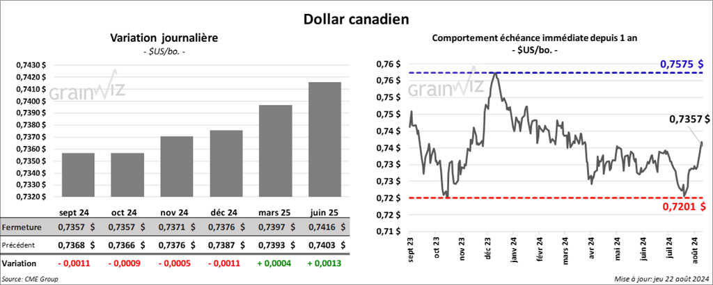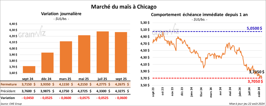 Le contrat de maïs US sept. 24 a clôturé à 3,7150 $ (- 4 ½ cents). Celui déc. 24 a fermé à 3,9350 $ (- 5 ¼ cents). Celui mars 25 a terminé à 4,1150 $ (- 6 cents).