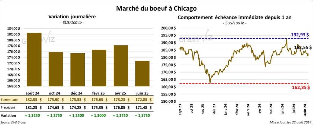 Le contrat de bœuf US août 24 a clôturé à 182,55 $ (+ 1,33 $). Celui oct. 24 a fermé à 175,90 $ (+ 1,28 $). Celui déc. 24 a terminé à 175,53 $ (+ 1,25 $). Quant au veau US, le contrat août 24 a fini à 241,97 $ (+ 2,73 $). Celui sept. 24 a clôturé à 238,20 $ (+ 2,52 $). Celui oct. 24 a fermé à 234,25 $ (+ 2,58 $).