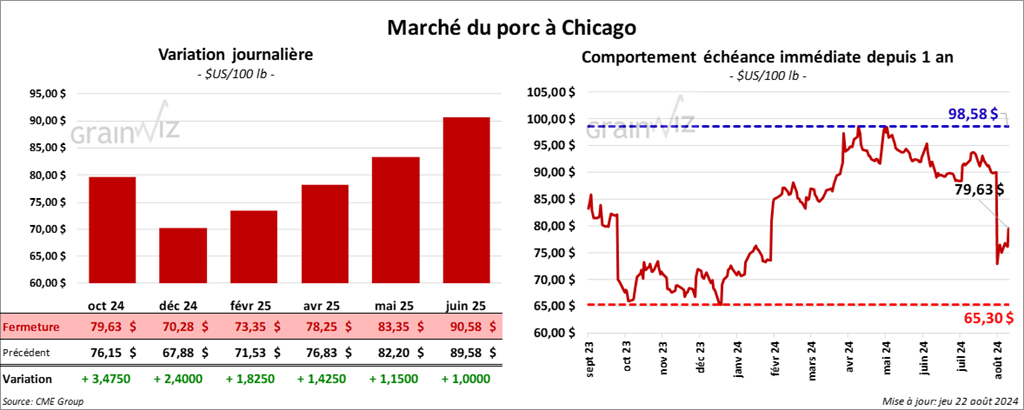 Le contrat de porc US oct. 24 a clôturé à 79,63 $ (+ 3 48 $). Celui déc. 24 a fermé à 70,28 $ (+ 2,40 $). Celui févr. 25 a terminé à 73,35 $ (+ 1,83 $).
