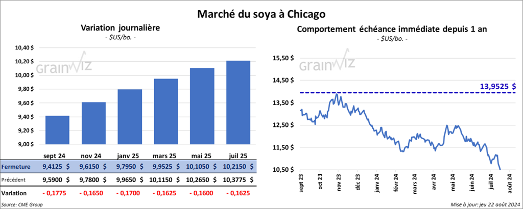 Le contrat de soya US sept. 24 a clôturé à 9,4125 $ (- 17 ¾ cents). Celui nov. 24 a fermé à 9,6150 $ (- 16 ½ cents). Celui janv. 25 a terminé à 9,7950 $ (- 17 cents). Quant au tourteau de soya US, le contrat sept. 24 a fini à 306,40 $/tonne (- 5,90 $/tonne). Celui oct. 24 a clôturé à 302,20 $/tonne (- 4,50 $/tonne). Celui déc. 24 a fermé à 304,10 $/tonne (- 4,50 $/tonne). Du côté de l’huile de soya US, le contrat sept. 24 a terminé à 40,44 $ (- 56 points). Celui oct. 24 a fini à 39,54 $ (- 66 points).