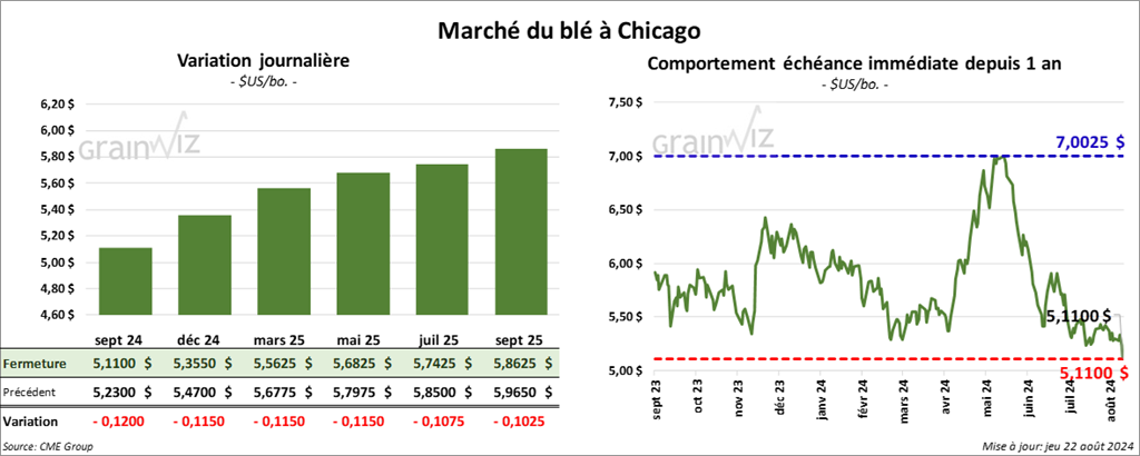 À Chicago, le contrat de blé sept. 24 a clôturé à 5,1100 $ (- 12 cents). Celui déc. 24 a fermé à 5,3550 $ (- 11 ½ cents). Celui mars 25 a terminé à 5,5625 $ (- 11 ½ cents). À Kansas, le contrat de blé dur rouge sept. 24 a fini à 5,2920 $ (- 7 cents). Celui déc. 24 a clôturé à 5,4500 $ (- 6 ¾ cents). Celui mars 25 a fermé à 5,5820 $ (- 6 ¾ cents). À Minneapolis, le contrat de blé de printemps sept. 24 a terminé à 5,6825 $ (- 13 cents). Celui déc. 24 a fini à 5,8400 $ (- 13 cents). Celui mars 25 a clôturé à 6,0375 $ (- 11 cents).