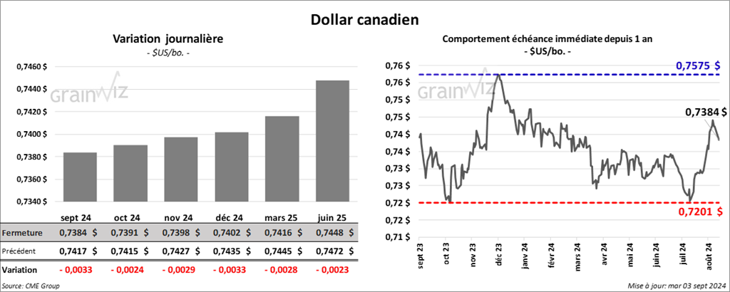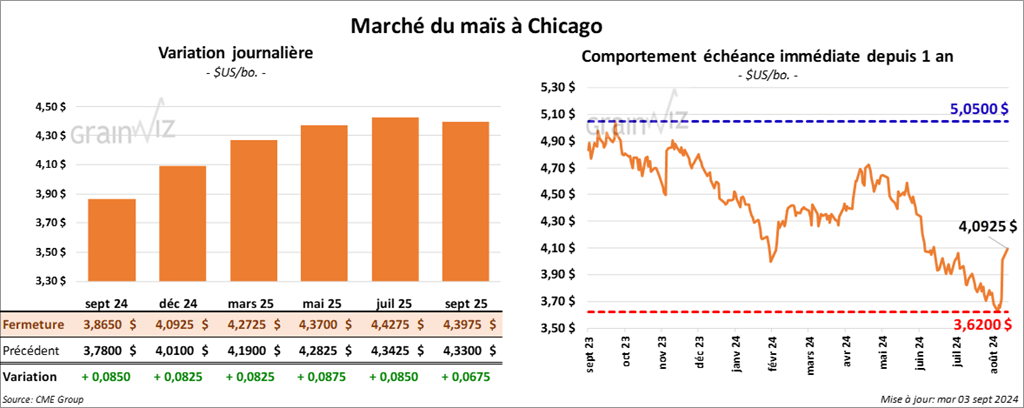 Le contrat de maïs sept. 24 a clôturé à 3,8650 $ (+ 8 ½ cents). Celui déc. 24 a fermé à 4,0925 $ (+ 8 ¼ cents). Celui mars 25 a terminé à 4,2725 $ (+ 8 ¼ cents).