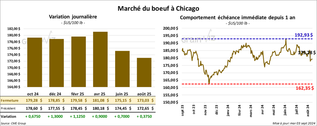 Le contrat de bœuf US oct. 24 a clôturé à 179,28 $ (+ 68 cents). Celui déc. 24 a fermé à 178,85 $ (+ 1,30 $). Celui févr. 24 a terminé à 179,58 $ (+ 1,13 $). Quant au veau US, le contrat sept. 24 a fini à 241,38 $ (+ 90 cents). Celui oct. 24 a clôturé à 239,32 $ (+ 1,57 $). Celui nov. 24 a fermé à 236,63 $ (+ 1,38 $).