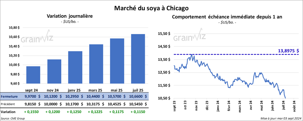 Le contrat de soya US sept. 24 a clôturé à 9,9700 $ (+ 15 ½ cents). Celui nov. 24 a fermé à 10,1200 $ (+ 12 cents). Celui janv. 25 a terminé à 10,2950 $ (+ 12 ½ cents). Quant au tourteau de soya US, le contrat sept. 24 a fini à 319,70 $/tonne (+ 7,80 $/tonne). Celui oct. 24 a clôturé à 317,40 $/tonne (+ 7,30 $/tonne). Celui déc. 24 a fermé à 320,80 $/tonne (+ 7,80 $/tonne). Du côté de l’huile de soya US, le contrat sept. 24 a terminé à 42,07 $ (- 107 points). Celui oct. 24 a fini à 41,48 $ (- 105 points).