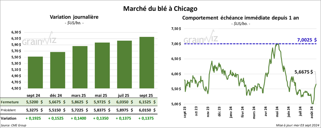 À Chicago, le contrat de blé sept. 24 a clôturé à 5,5200 $ (+ 19 ¼ cents). Celui déc. 24 a fermé à 5,6675 $ (+ 15 ¼ cents). Celui mars 25 a terminé à 5,8625 $ (+ 14 cents). À Kansas, le contrat de blé dur rouge sept. 24 a fini à 5,6640 $ (+ 14 cents). Celui déc. 24 a clôturé à 5,7620 $ (+ 11 cents). Celui mars 25 a fermé à 5,8960 $ (+ 12 cents). À Minneapolis, le contrat sept. 24 a terminé à 5,7850 $ (+ 4 ¾ cents). Celui déc. 24 a fini à 6,0725 $ (+ 6 ¾ cents). Celui mars 25 a clôturé à 6,2875 $ (+ 7 cents).