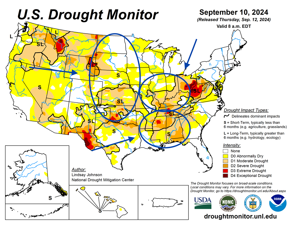- Dans son rapport présenté ce matin, l’US Drought Monitor mentionne qu’au 10 septembre dernier, 18 % des plants de maïs US se trouvaient dans des zones de sécheresse, ce qui était une augmentation de 6 points par rapport à la semaine passée.