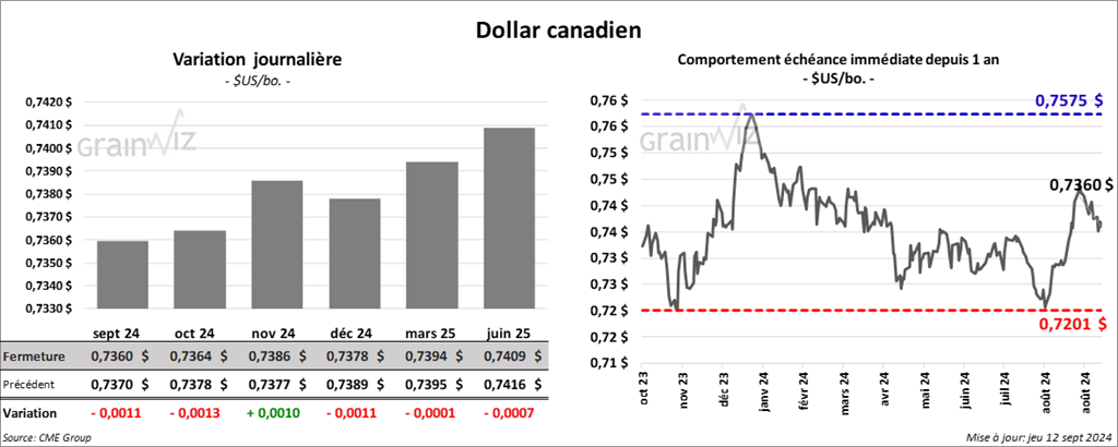 Le contrat de maïs US sept. 24 a clôturé à 3,8625 $ (+ 5 ¾ cents). Celui déc. 24 a fermé à 4,0600 $ (+ 1 ¼ cent). Celui mars 25 a terminé à 4,2450 $ (+ 1 cent).