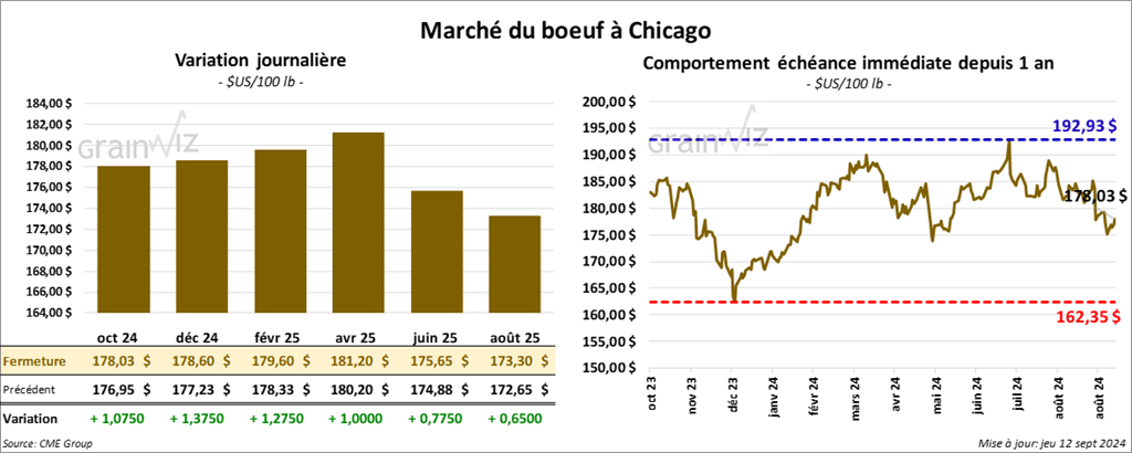 Le contrat de bœuf US oct. 24 a clôturé à 178,03 $ (+ 1,08 $). Celui déc. 24 a fermé à 178,60 $ (+ 1,38 $). Celui févr. 25 a terminé à 179,60 $ (+ 1,28 $). Quant au veau US, le contrat sept. 24 a fini à 242,05 $ (+ 1,05 $). Celui oct. 24 a clôturé à 239,75 $ (+ 2,25 $). Celui nov. 24 a fermé à 235,47 $ (+ 1,45 $).