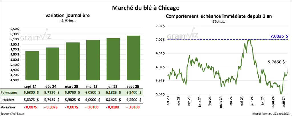 À Chicago, le contrat de blé sept. 24 a clôturé à 5,6300 $ (- ¾ cent). Celui déc. 24 a fermé à 5,7850 $ (- ¾ cent). Celui mars 25 a terminé à 5,9750 $ (- ¾ cent). À Kansas, le contrat de blé dur rouge sept. 24 a fini à 5,7840 $ (- 2 ¼ cents). Celui déc. 24 a clôturé à 5,8620 $ (- 2 cents). Celui mars 25 a fermé à 5,9960 $ (- 1 ½ cent). À Minneapolis, le contrat de blé de printemps sept. 24 a terminé à 5,9425 $ (+ 5 ¼ cents). Celui déc. 24 a fini à 6,2175 $ (+ 5 ¼ cents). Celui mars 25 a clôturé à 6,4325 $ (+ 5 ¾ cents).