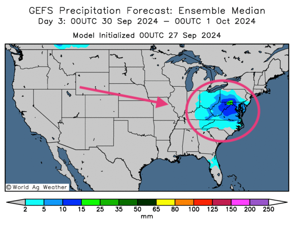 - Globalement, les conditions météo US sont correctes à court terme. L’analyse des cartes US, fournies par World Ag Weather et dessinées jusqu’au 3ème jour, montre surtout que l’ouragan Helene pourrait perdre de la force en errant dans le sud des Grands Lacs et dans certaines parties du nord du Sud-Est comme le Tennessee, le Kentucky et les Carolines. Ailleurs, dans l’ouest du Midwest et la totalité des Plaines US, le temps pourrait demeurer sec, ce qui devrait faciliter le processus des récoltes.