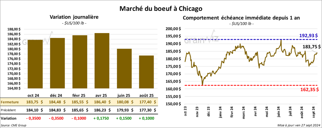 Le contrat de bœuf US oct. 24 a clôturé à 183,75 $ (- 35 cents). Celui déc. 24 a fermé à 184,48 $ (- 35 cents). Celui févr. 25 a terminé à 185,55 $ (- 10 cents). Quant au veau US, le contrat oct. 24 a fini à 247,07 $ (+ 15 cents). Celui nov. 24 a clôturé à 245,70 $ (+ 72 cents). Celui janv. 25 a fermé à 239,60 $ (+ 85 cents).