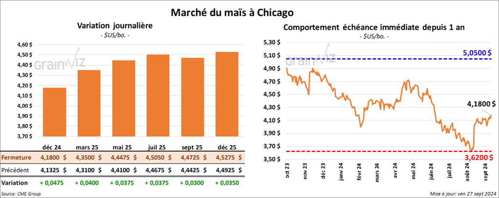 Le contrat de maïs US déc. 24 a clôturé à 4,1800 $ (+ 4 ¾ cents). Celui mars 25 a fermé à 4,3500 $ (+ 4 cents). Celui mai 25 a terminé 4,4475 $ (+ 3 ¾ cents).