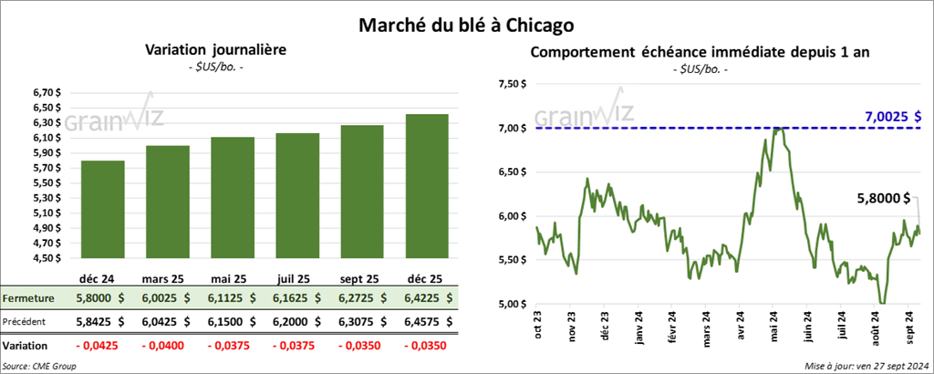 À Chicago, le contrat de blé déc. 24 a clôturé à 5,8000 $ (- 4 ¼ cents). Celui mars 25 a fermé à 6,0025 $ (- 4 cents). Celui mai 25 a terminé à 6,1125 $ (- 3 ¾ cents). À Kansas, le contrat de blé dur rouge déc. 24 a fini à 5,7660 $ (- 2 ¼ cents). Celui mars 25 a clôturé à 5,9160 $ (- 2 cents). Celui mai 25 a fermé à 6,0120 $ (- 1 ½ cent). À Minneapolis, le contrat de blé de printemps déc. 24 a terminé à 6,0825 $ (- 3 ¼ cents). Celui mars 25 a fini à 6,3025 $ (- 3 ¼ cents). Celui mai 25 a clôturé à 6,4150 $ (- 3 ½ cents).