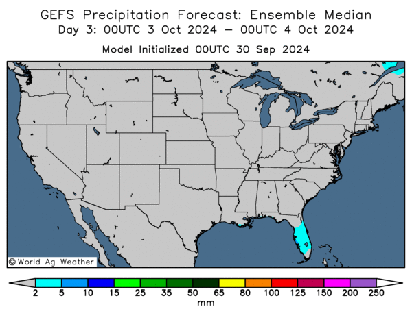 - Cette carte US, fournie par World Ag Weather et dessinée pour le 3ème jour, indique un temps sans nuage pour la totalité des Plaines US, du Midwest et du Sud-Est US (voir les zones grises).