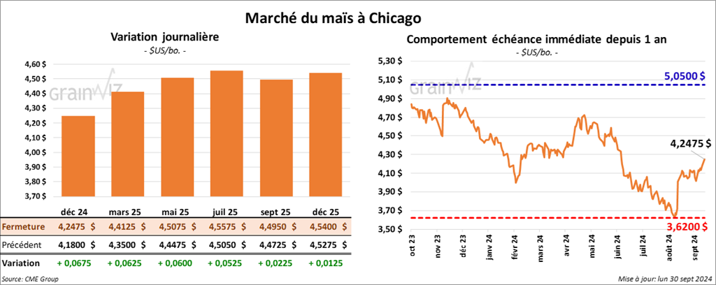 Le contrat de maïs US déc. 24 a clôturé à 4,2475 $ (+ 6 ¾ cents). Celui mars 25 a fermé à 4,4125 $ (+ 6 ¼ cents). Celui mars 25 a terminé à 4,5075 $ (+ 6 cents).