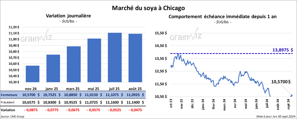 Le contrat de soya US nov. 24 a clôturé à 10,5700 $ (- 8 ¾ cents). Celui janv. 25 a fermé à 10,7525 $ (- 7 ¾ cents). Celui mars 25 a terminé à 10,8850 $ (- 6 ¾ cents). Quant au tourteau de soya US, le contrat oct. 24 a fini à 344,30 $/tonne (+ 60 cents/tonne). Celui déc. 24 a clôturé à 341,60 $/tonne (- 2,50 $/tonne). Celui janv. 25 a fermé à 341,90 $/tonne (- 2,30 $/tonne). Du côté de l’huile de soya US, le contrat oct. 24 a terminé à 43,51 $ (+ 133 points). Celui déc. 24 a fini à 43,31 $ (+ 95 points).