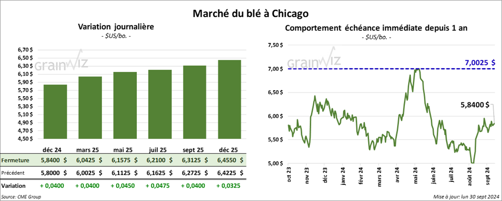 À Chicago, le contrat de blé déc. 24 a clôturé à 5,8400 $ (+ 4 cents). Celui mars 25 a fermé à 6,0425 $ (+ 4 cents). Celui mai 25 a terminé à 6,1575 $ (+ 4 ½ cents). À Kansas, le contrat de blé dur rouge déc. 24 a fini à 5,8360 $ (+ 7 cents). Celui mars 25 a clôturé à 5,9820 $ (+ 6 ½ cents). Celui mai 25 a fermé à 6,0740 $ (+ 6 ¼ cents). À Minneapolis, le contrat de blé de printemps déc. 24 a terminé à 6,1925 $ (+ 11 cents). Celui mars 25 a fini à 6,4125 $ (+ 11 cents). Celui mai 25 a clôturé à 6,5300 $ (+ 11 ½ cents).