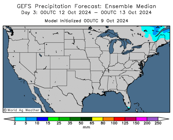- Cette carte US, fournie par World Ag Weather et dessinée pour le 3ème jour, montre un ciel dégagé pour la totalité du territoire US (voir zone grise).