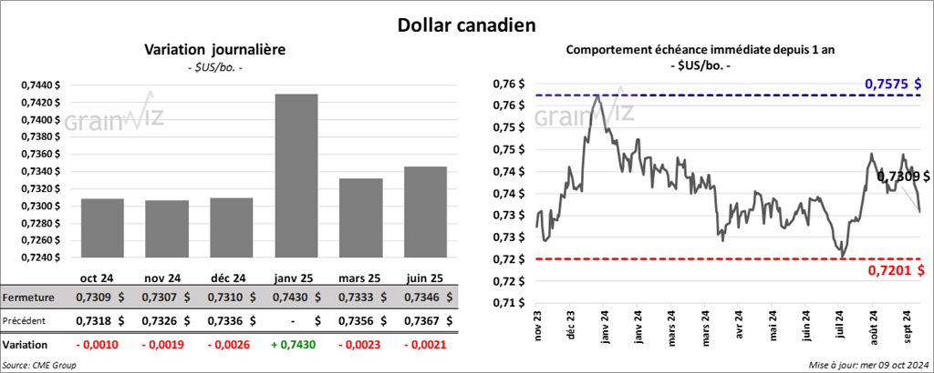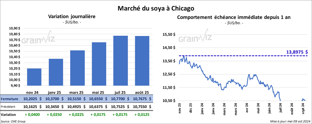 Le contrat de soya US nov. 24 a clôturé à 10,2025 $ (+ 4 cents). Celui janv. 25 a fermé à 10,3700 $ (+ 2 ½ cents). Celui mars 25 a terminé à 10,5150 $ (+ 2 ¼ cents). Quant au tourteau de soya US, le contrat oct. 24 a fini à 322,50 $/tonne (- 1,10 $/tonne). Celui déc. 24 a clôturé à 321,20 $/tonne (- 1,80 $/tonne). Celui janv. 25 a fermé à 320,30 $/tonne (- 1,50 $/tonne). Du côté de l’huile de soya US, le contrat oct. 24 a terminé à 43,26 $ (- 11 points). Celui déc. 24 a fini à 43,06 $ (- 3 points).