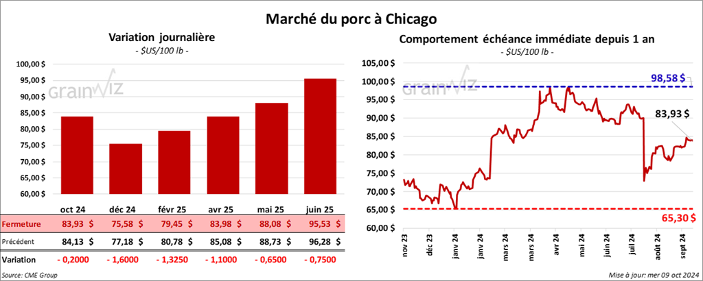 Le contrat de porc US oct. 24 a clôturé à 83,93 $ (- 20 cents). Celui déc. 24 a fermé à 75,58 $ (- 1,60 $). Celui févr. 25 a terminé à 79,45 $ (- 1,33 $).