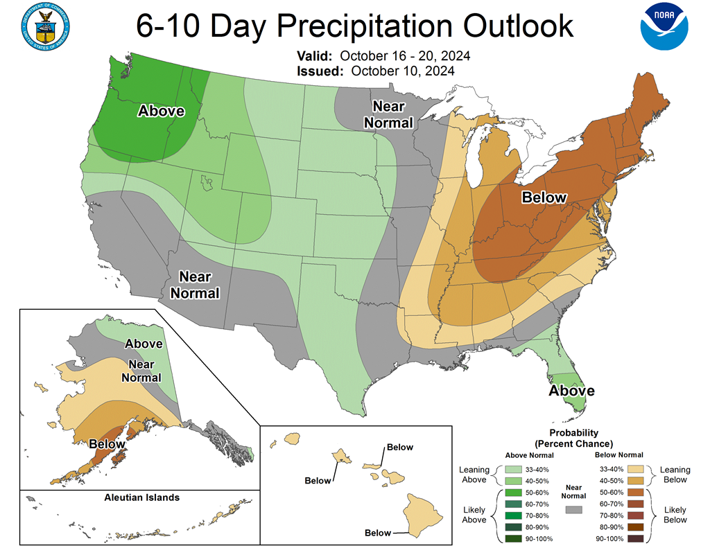 - Cette carte US, fournie par le NOAA et valide du 16 au 20 octobre prochains, révèle notamment que le centre et l’est du Midwest pourraient connaitre un temps plus sec que la normale (voir taches beiges). L’ouest du Midwest et le reste des Plaines US pourraient, quant à eux, recevoir des précipitations dans la normale ou au-delà de la normale.