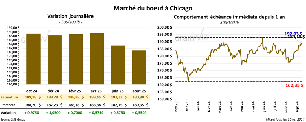 Le contrat de bœuf US oct. 24 a clôturé à 189,18 $ (+ 98 cents). Celui déc. 24 a fermé à 188,28 $ (+ 1,05 $). Celui févr. 25 a terminé à 188,88 $ (+ 70 cents). Quant au veau US, le contrat oct. 24 a fini à 250,28 $ (+ 1,00 $). Celui nov. 24 a clôturé à 249,95 $ (+ 1,27 $). Celui janv. 25 a fermé à 247,20 $ (+ 1,32 $).