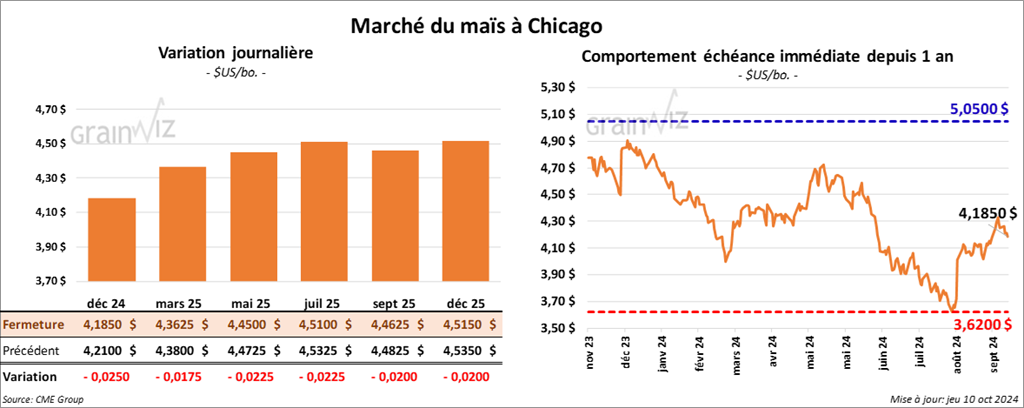 Le contrat de maïs US déc. 24 a clôturé à 4,1850 $ (- 2 ½ cents). Celui mars 25 a fermé à 4,3625 $ (- 1 ¾ cent). Celui mai 25 a terminé à 4,4500 $ (- 2 ¼ cents).