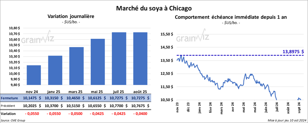 Le contrat de soya US nov. 24 a clôturé à 10,1475 $ (- 5 ½ cents). Celui janv. 25 a fermé à 10,3150 $ (- 5 ½ cents). Celui mars 25 a terminé à 10,4650 $ (- 5 cents). Quant au tourteau de soya US, le contrat oct. 24 a fini à 317,50 $/tonne (- 5,00 $/tonne). Celui déc. 24 a clôturé à 316,10 $/tonne (- 5,10 $/tonne). Celui janv. 25 a fermé à 315,80 $/tonne (- 4,50 $/tonne). Du côté de l’huile de soya US, le contrat oct. 24 a terminé à 43,87 $ (+ 61 points). Celui déc. 24 a fini à 43,76 $ (+ 70 cents).