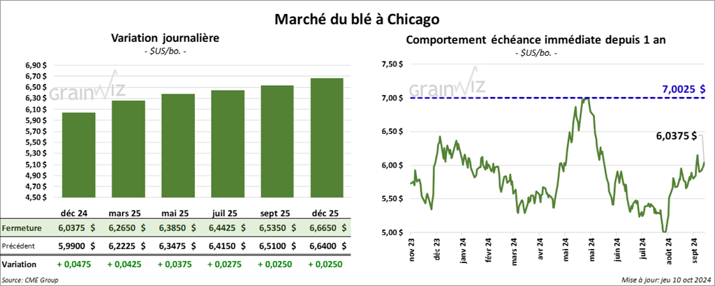 À Chicago, le contrat déc. 24 a clôturé à 6,0375 $ (+ 4 ¾ cents). Celui mars 25 a fermé à 6,2650 $ (+ 4 ¼ cents). Celui mai 25 a terminé à 6,3850 $ (+ 3 ¾ cents). À Kansas, le contrat de blé dur rouge d’hiver déc. 24 a fini à 6,0875 $ (+ 5 cents). Celui mars 25 a clôturé à 6,2500 $ (+ 4 ¾ cents). Celui mai 25 a fermé à 6,3500 $ (+ 4 ¼ cents). À Minneapolis, le contrat de blé d’hiver déc. 24 a terminé à 6,5025 $ (+ 2 cents). Celui mars 25 a fini à 6,7100 $ (+ 2 ¼ cents). Celui mai 25 a clôturé à 6,8200 $ (+ 2 ¼ cents).