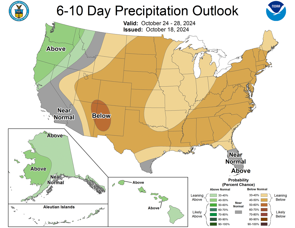- Cette carte US, fournie par le NOAA et valide du 24 au 28 octobre prochain, indique que le temps sera anormalement sec à travers la majorité le territoire US, incluant la totalité du Midwest et des Plaines US (voir les zones beiges).