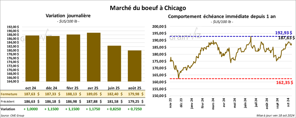 Le contrat de bœuf US oct. 24 a clôturé à 187,63 $ (+ 1,00 $). Celui déc. 24 a fermé à 187,33 $ (+ 1,15 $). Celui févr. 25 a terminé à 188,13 $ (+ 1,15 $). Quant au veau US, le contrat oct. 24 a fini à 248,32 $ (+ 1,60 $). Celui nov. 24 a clôturé à 247,60 $ (+ 1,85 $). Celui janv. 25 a fermé à 345,50 $ (+ 2,38 $).