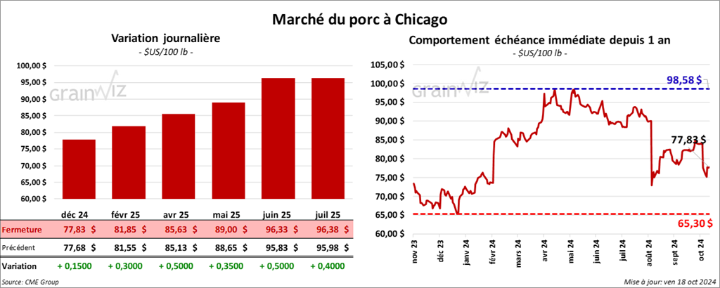 Le contrat de porc US déc. 24 a clôturé à 77,83 $ (+ 15 cents). Celui févr. 25 a fermé à 81,85 $ (+ 30 cents). Celui avr. 25 a terminé à 85,63 $ (+ 50 cents).