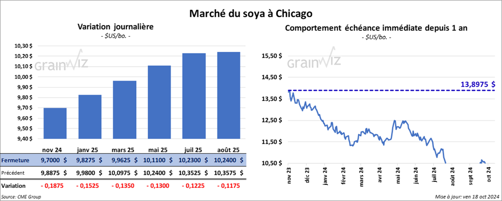 Le contrat de soya US nov. 24 a clôturé à 9,7000 $ (- 18 ¾ cents). Celui janv. 25 a fermé à 9,8275 $ (- 15 ¼ cents). Celui mars 25 a terminé à 9,9625 $ (- 13 ½ cents). Quant au tourteau de soya US, le contrat déc. 24 a fini à 315,60 $/tonne (- 2,50 $/tonne). Celui janv. 25 a clôturé à 313,30 $/tonne (- 1,60 $/tonne). Celui mars 25 a fermé à 313,60 $/tonne (- 1,50 $/tonne). Du côté de l’huile de soya US, le contrat déc. 24 a terminé à 41,82 $ (- 77 points). Celui janv. 25 a fini à 41,67 $ (- 68 points).
