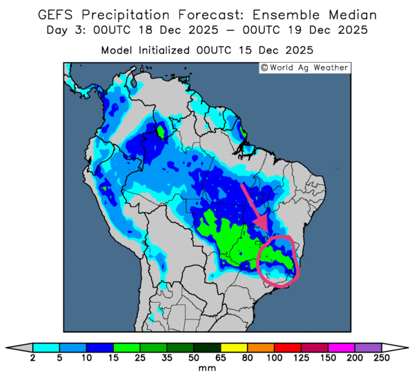 - Globalement, les prévisions météo pour le Brésil semblent correctes, mais à surveiller à court terme. L'analyse des cartes du Brésil GFS, fournies par World Ag Weather et illustrées jusqu'au 3e jour, révèle des possibilités de pluie pour la plupart des régions de production. Toutefois, les averses pourraient être très abondantes et persistantes dans l'est et certaines parties du centre du pays. Des États comme le Minas Gerais dans l’est pourrait connaître des précipitations trop élevées, de sorte que les sols pourraient être saturés par endroit (voir la carte du 3e jour présentée ci-contre).