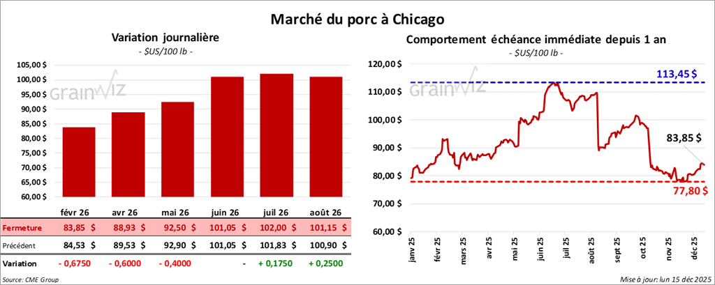 Le contrat de porc américain février 26 a clôturé à 83,85 $ (-68 cents). Celui avril 26 a fermé à 88,93 $ (- 60 cents). Celui mai 26 a clôturé à 92,50 $ (- 40 cents).