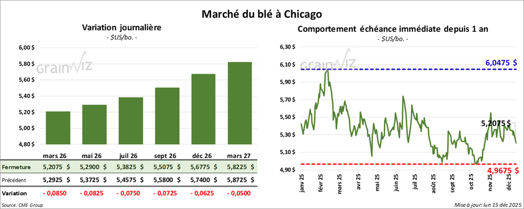 À Chicago, le contrat de blé mars 26 a clôturé à 5,2075 $ (-8 ½ cents). Celui mai 26 a fermé à 5,2900 $ (- 8 ¼ cents). Celui juillet 26 a terminé à 5,3825 $ (- 7 ½ cents).