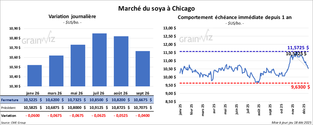 Le contrat de soya américain janvier 26 a clôturé à 10,5225 $ (- 6 cents). Celui mars 26 a fermé à 10,6200 $ (- 6 ¾ cents). Celui mai 26 a terminé à 10,7325 $ (- 6 ¾ cents).