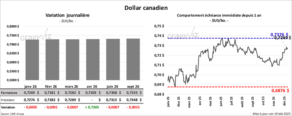 Du côté de l'huile de soya américaine, le contrat janvier 26 a terminé à 47,90 $ (-21 points). Celui mars 26 a fini à 48,44 $ (-18 points).