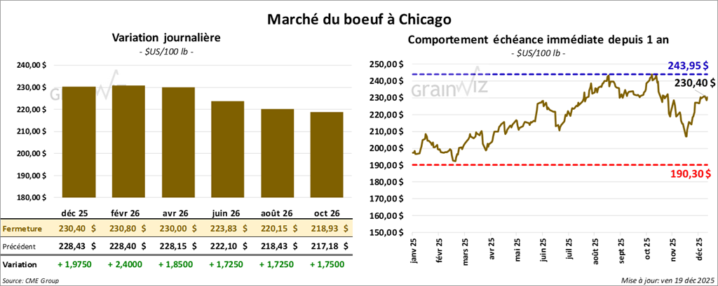 Le contrat de bœuf américain décembre 25 a clôturé à 230,40 $ (+ 1,98 $). Celui février 26 a fermé à 230,80 $ (+ 2,40 $). Celui avril 26 a terminé à 230,00 $ (+ 1,85 $).