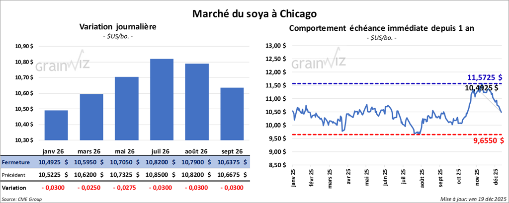 Le contrat de soya américain janvier 26 a clôturé à 10,4925 $ (-3 cents). Celui mars 26 a fermé à 10,5950 $ (- 2 ½ cents). Celui mai 26 a terminé à 10,7050 $ (- 2 ¾ cents).