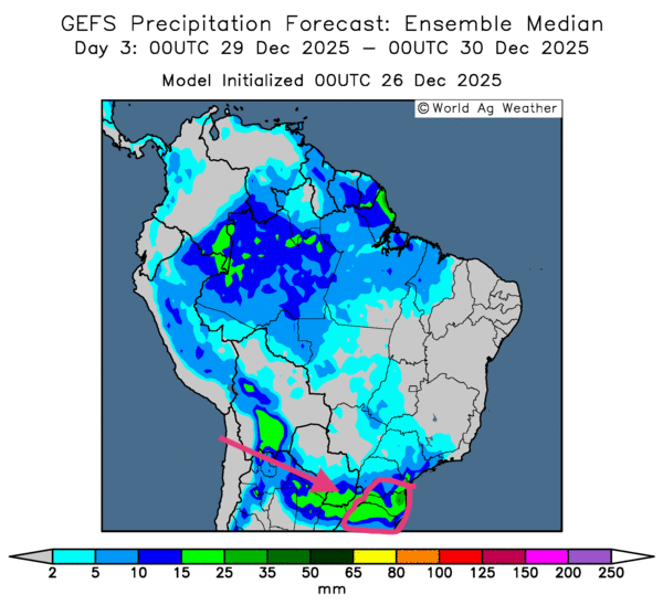 • Globalement, les prévisions météo pour le Brésil demeurent favorables à court terme. L’analyse des cartes du Brésil GFS, fournies par World Ag Weather et illustrées jusqu’au 3e jour, montre une météo relativement variable, mais globalement bénéfique pour la plupart des régions de production, y compris l’extrême sud, c’est-à-dire le Rio Grande do Sul.
